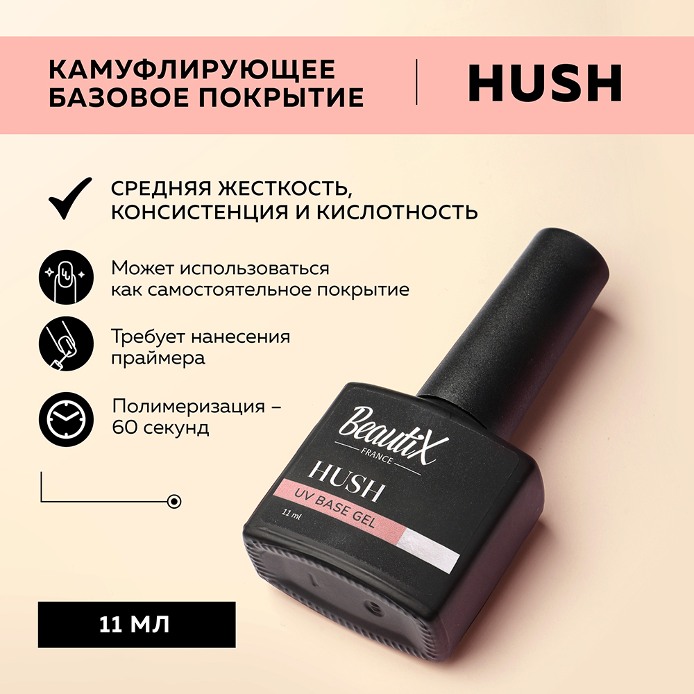 Камуфлирующая база Beautix Hush сочетает в себе функции базы и лёгкого цветного покрытия. Имеет нежный бежевый оттенок с полупрозрачным эффектом, который маскирует неровности и мелкие дефекты ногтевой пластины. Подходит для создания натурального ню…
