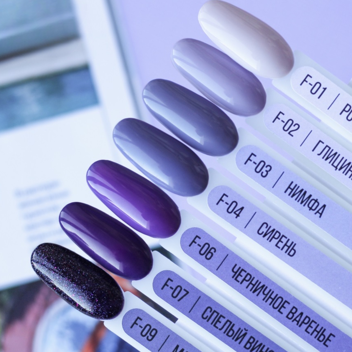 Серия F включает 22 оттенка гель-лаков в фиолетово-сиреневой палитре: от светлых пастельных и лавандовых тонов до насыщенных сливовых, тёмных ягодных и глиттерных текстур. В коллекции есть как спокойные нюдо…