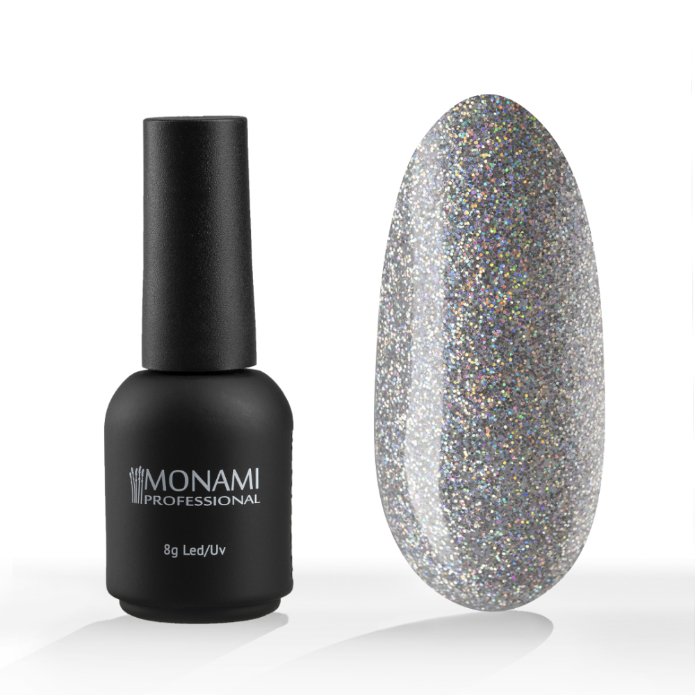 Гель-лак Monami насыщенного красного цвета с большим количеством голографических блёсток, средней консистенции.