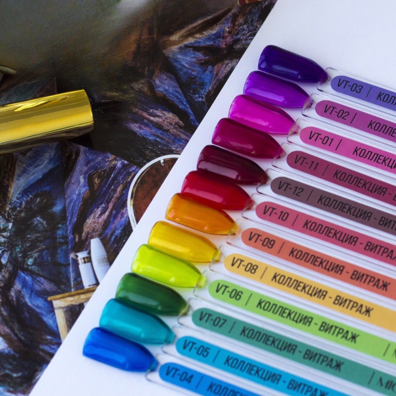 Коллекция Витраж - 12 оттенков с эффектом цветного стекла. Эти гель-лаки станут прекрасным поводом для творчества и создания необычных дизайнов на ногтях/ VT-08 – насыщенный жёлтый оттенок.