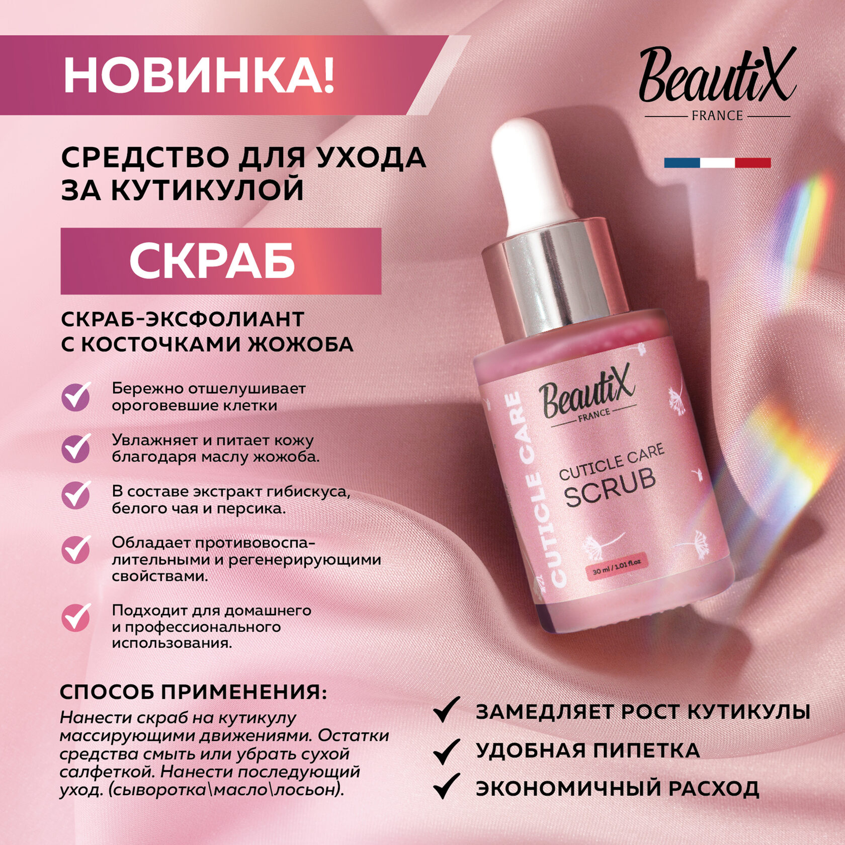 BeautiX Cuticle Scrub — это нежный скраб-сыворотка для ухода за кутикулой, созданный на основе натуральных эксфолиантов из косточек жожоба. Средство мягко отшелушивает ороговевшие клетки, сти…