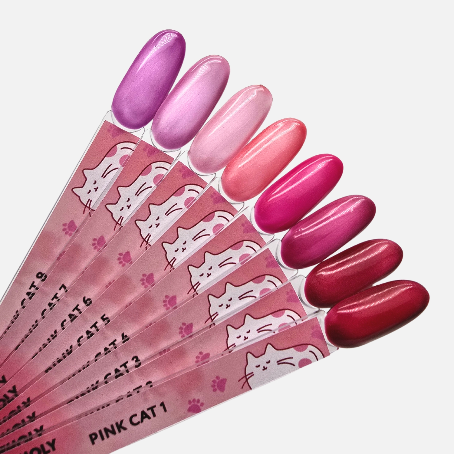Коллекция гель-лаков «Pink Cat» от Holy Molly – это магия света и глубины в каждом движении. Благодаря магнитному пигменту мелкого помола, покрытие приобретает объемное сияние и выразительный перелив, создавая эффект гипнотического «кошачьего глаза».h